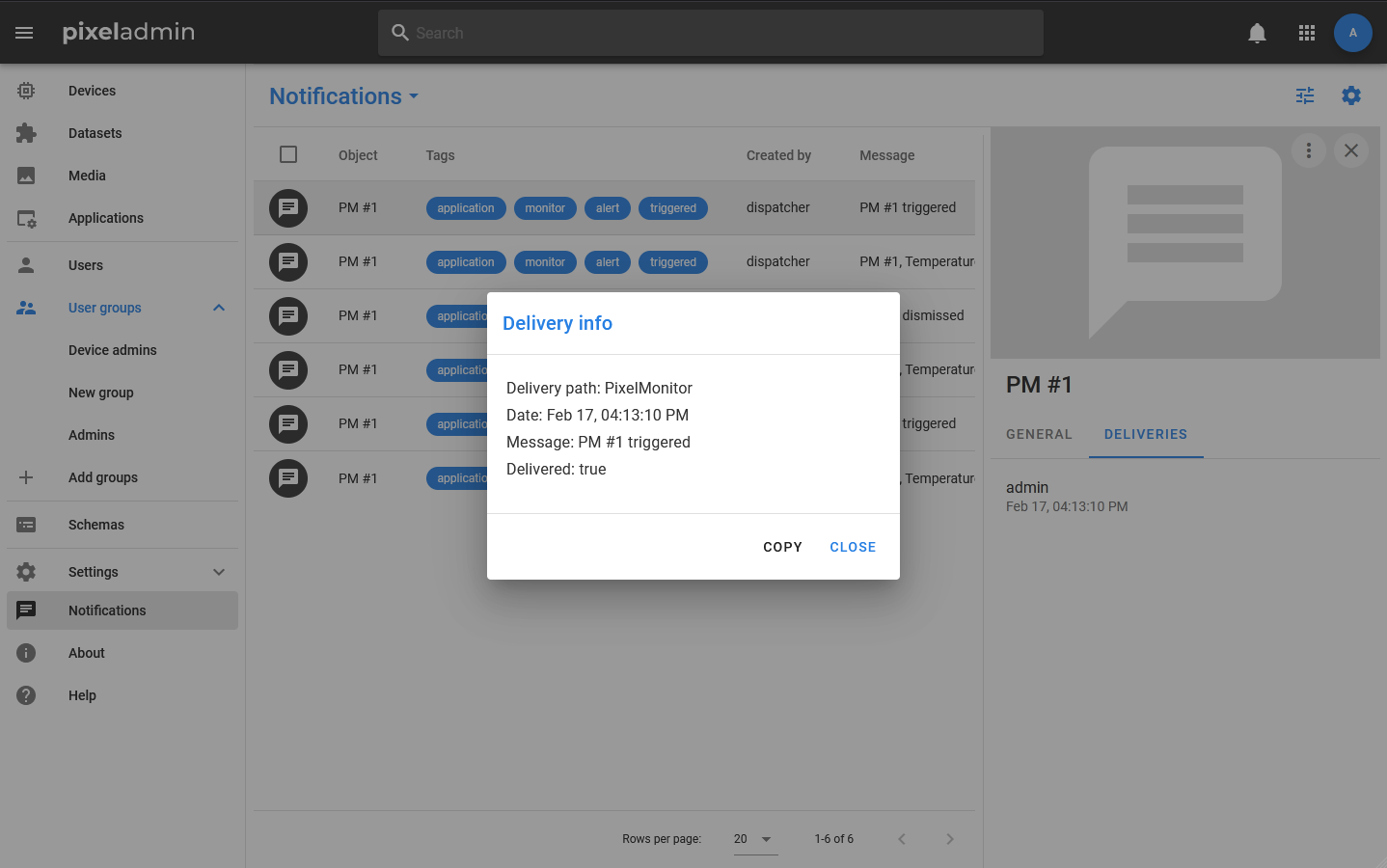 The Pixel Admin application has a notification system (notifications): they can be generated by the system when certain events occur, and can also be sent by users through the application interface.